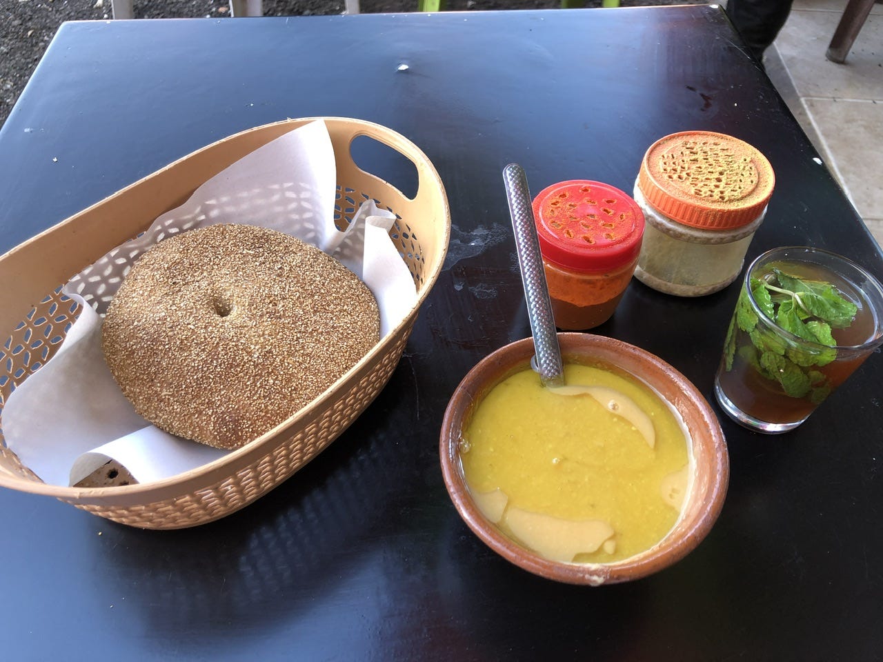 街角で、屋台で、毛布を入れた手押し車で、商店で、どこにいてもいつも目にするのはホブズ。アラビア語でパンのことで、男性の手を広げたくらいのサイズの平たい素朴なパン。これか、もしくはイムスィンメンと呼ばれるクレープのようなものを蜂蜜やバターを合わせ、小瓶のようなサイズの小さなガラスのグラスにミントの葉っぱをわさっと入れた甘いミントティーを飲む。これがモロッコでよく見かける朝食のスタイル。