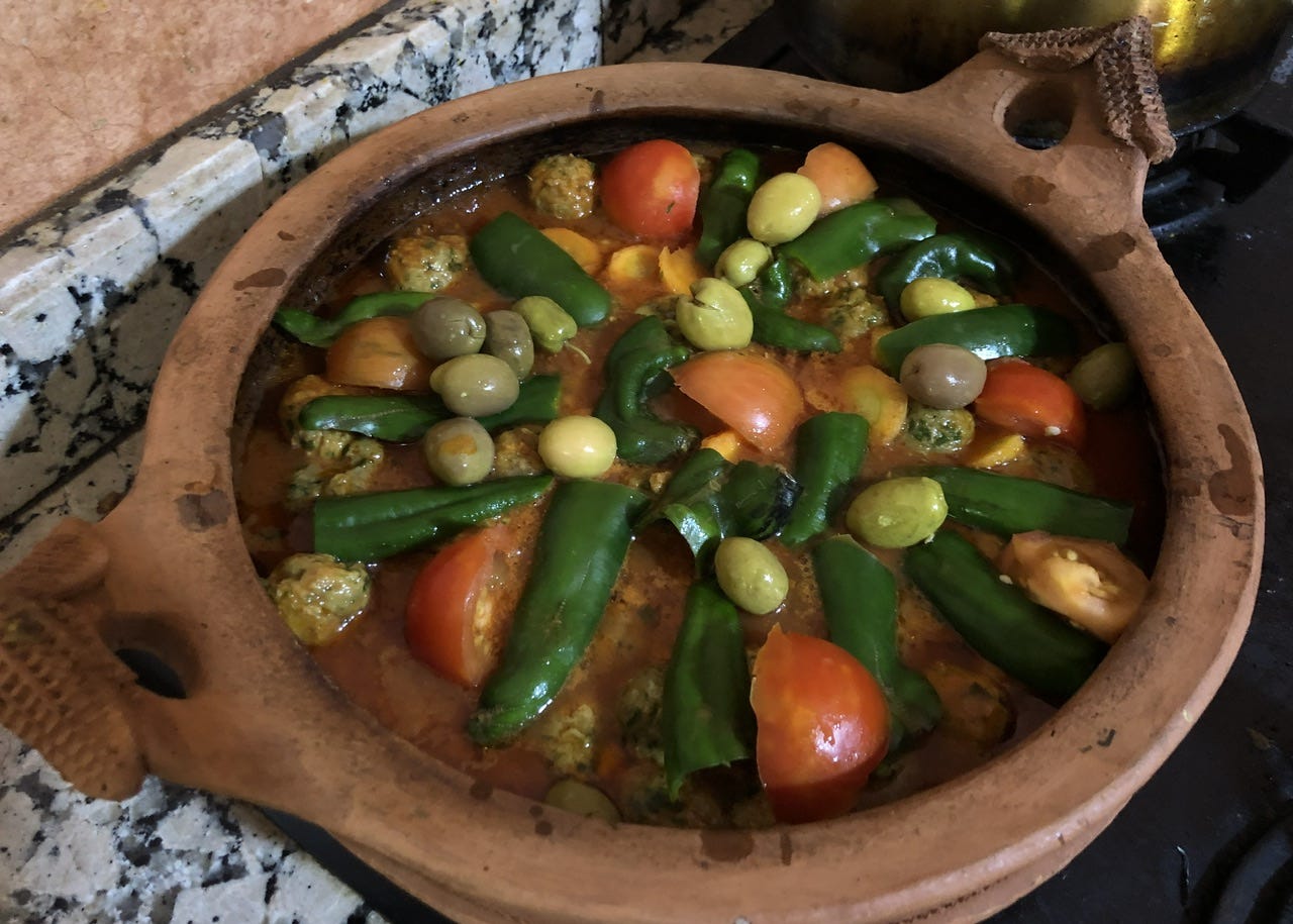タジンはじっくり蒸し煮して野菜の水を使った無水鍋。具材はその季節にあるものを何でも入れて良いと思う。アディルはいつも最初に輪切りの玉ねぎを敷き詰め、じゃがいも、かぶ、人参、なす、きゅうり、トマト、そして漬けオリーブ、大蒜、唐辛子を1本なんかを入れる。根菜と水っぽい野菜を両方入れると美味しいし、鶏肉や牛肉、ラムを入れても良い。りんごやデーツなど甘みのあるものを入れるのもまた良い。