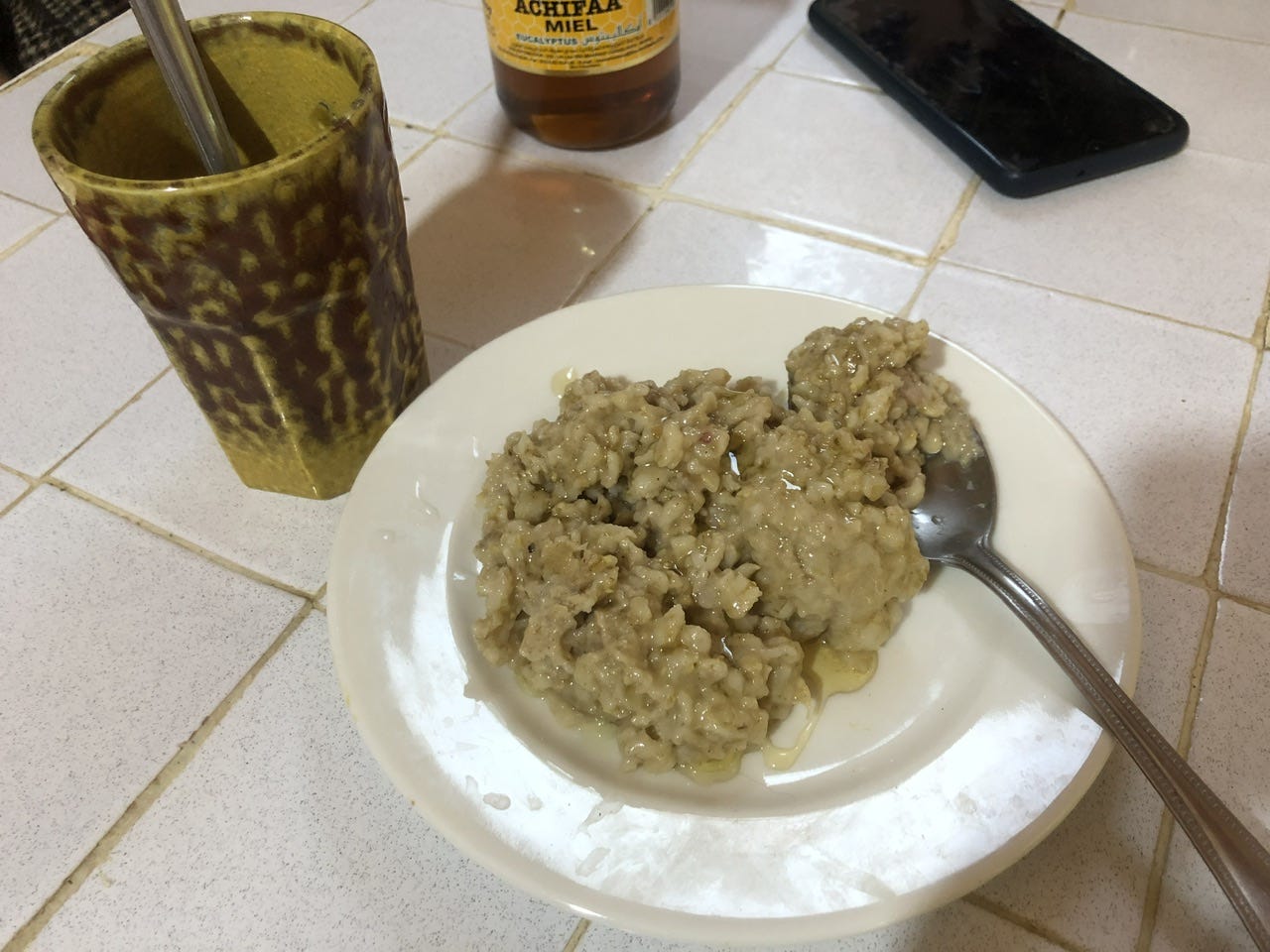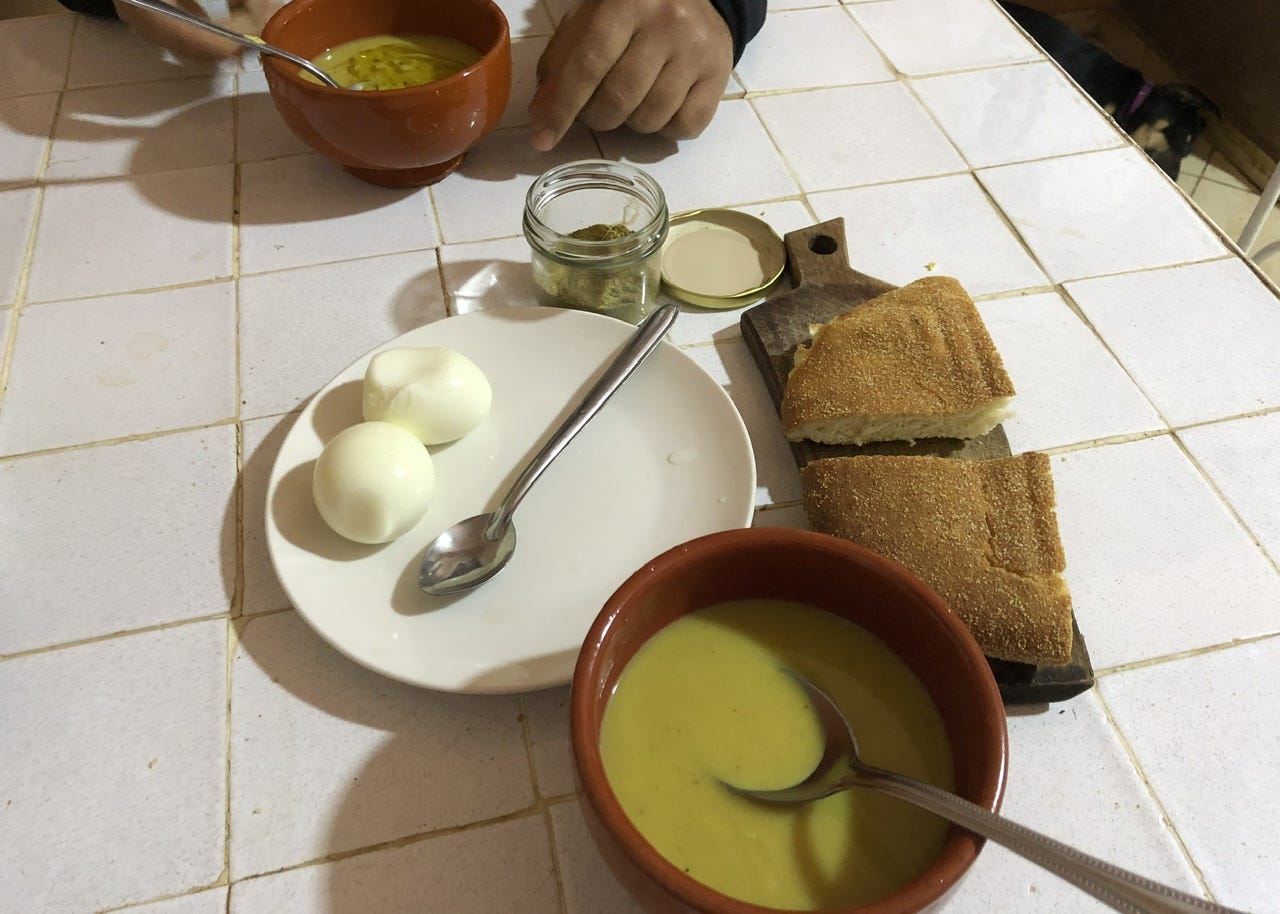 この農園はどこからも遠いので、ホブズが無いことも多い。なので彼が朝食によく食べているのはシュヴェンという、大麦粉の大きめの粒のものを水と混ぜ、りんごとバナナ、デーツを加えて煮たもの。大麦でなくてオーツのこともある。鍋から器へ移してから、オリーブオイルと蜂蜜を回しかけて食べる。「5分で作れるし、ホブズが無い時に作って食べるもの」だそうだ。