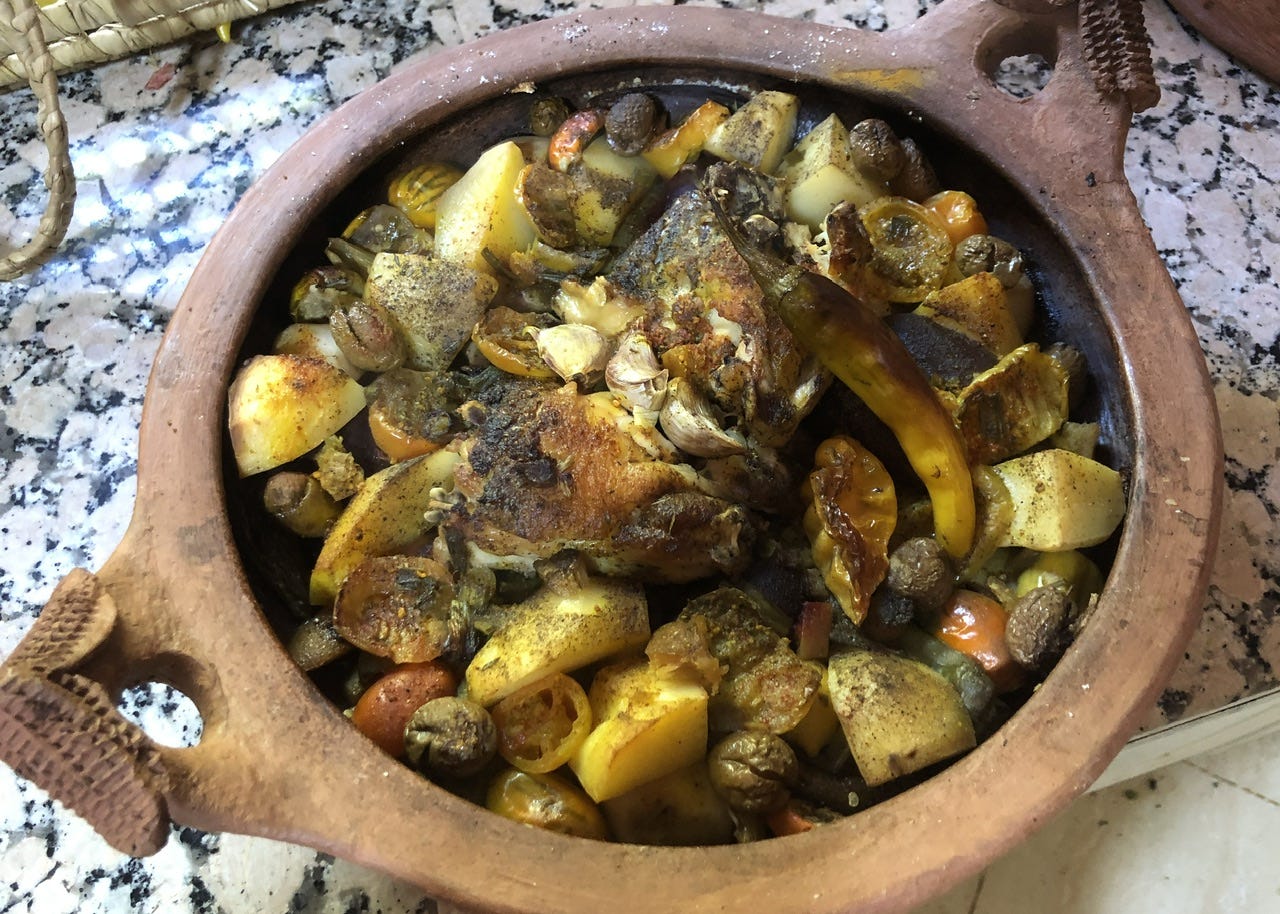 昼に農園の仕事から休憩で戻ってくると、どこからともなく持ってきた幾つかの根菜をアディルが洗っている。すると「今日はタジンを作るんだな」と分かる。タジンはモロッコ全土で日常的によく食べられるいわゆる鍋料理で、三角錐のような蓋を持つ陶器の浅い鍋に、野菜や肉を敷き詰めてスパイスとオリーブオイルを回しかけ、蓋をして火にかける。鍋のフォルムは土鍋をイメージすると近い。